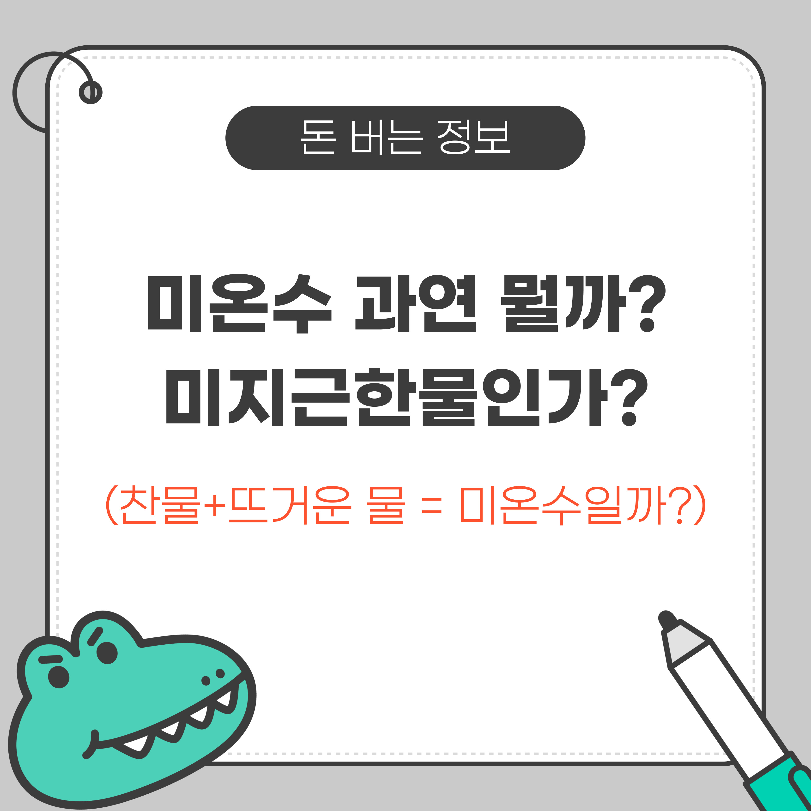 미온수는 단순히 찬물과 뜨거운 물을 섞은 것이 아니라 **섭씨 30~40도 정도의 따뜻한 물을 의미**합니다.